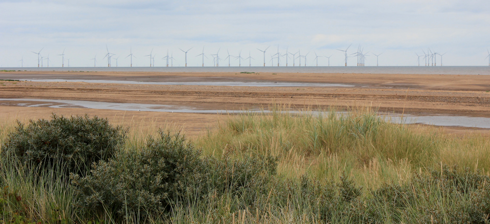 After another mile, or so, the path runs closer to the shore. The tide is out, and I can see several layers of sandbanks, a grey line of sea, and a host of silent wind turbines further out in the water.