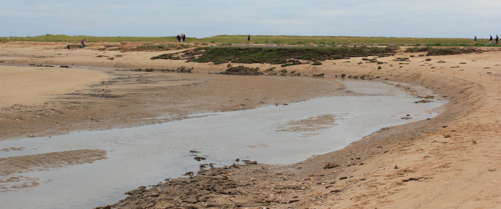 Continuing parallel to the shoreline, I reach the banks of a tidal creek. There are people walking in the distance, along a raised spit of land. The first people I’ve seen for some time.