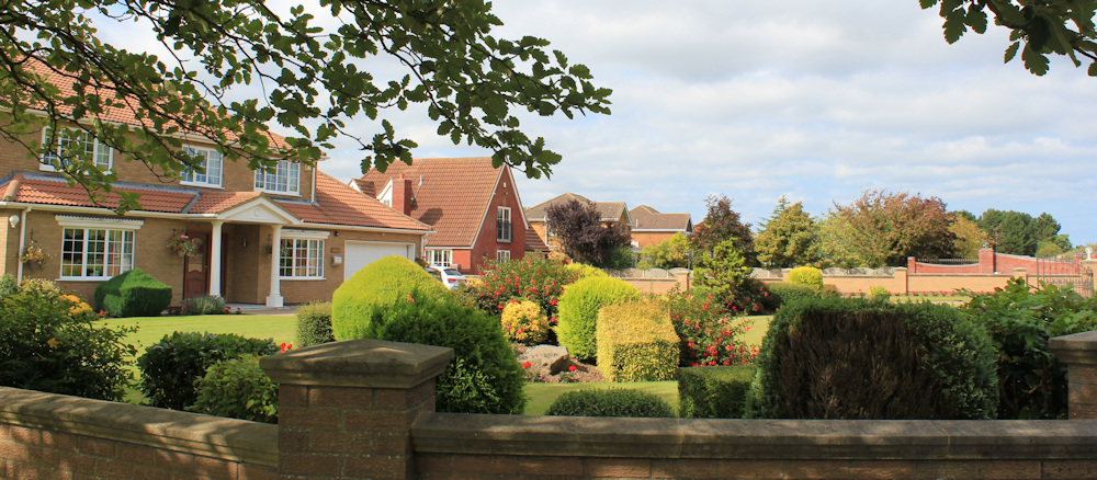 Onwards. Past an open field with planning permission for new houses. The sign promises “Stunning views of the coast and The Wolds”. Hmmm. Yes, it would be possible to see the coast, I assume, from the top floor of these proposed houses, but The Wolds are a faint ridge on the distant horizon. The designs look stunning though. Yes, I could live in one of those.