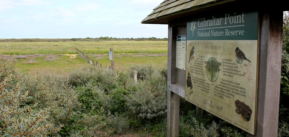 About a mile after leaving the car park, I come to an information board, half hidden in the bushes. “Gibraltar Point. National Nature Reserve.” I must be nearly there.