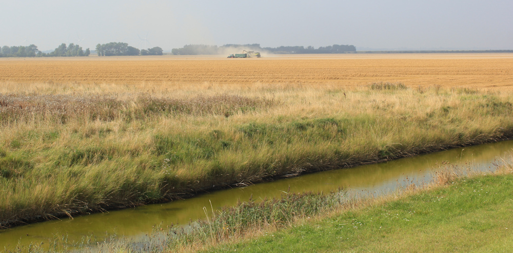 Continuing along the sea bank, I leave the workmen behind, and now I’m quite alone. Just the distant rumble of tractors for company. Another huge Lincolnshire field is being harvested.