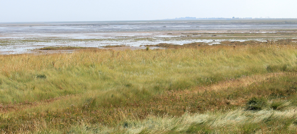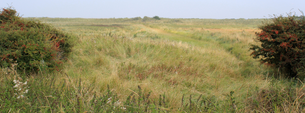 On my right, across grass and marsh, I can see all the way to… I check my map… that must be the raised sandbank area with trees at Donna Nook. It looks a long way away, but I think that’s an optical illusion created by the haze.