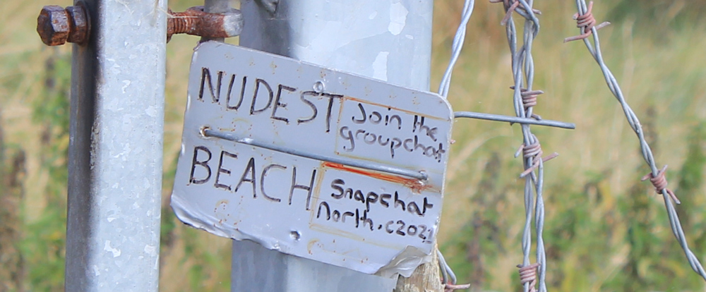 There is a broken sign on the ground which indicates the land is private, but another, much smaller sign, stuck to the gate, gives the game away. “Nudest Beach.”
