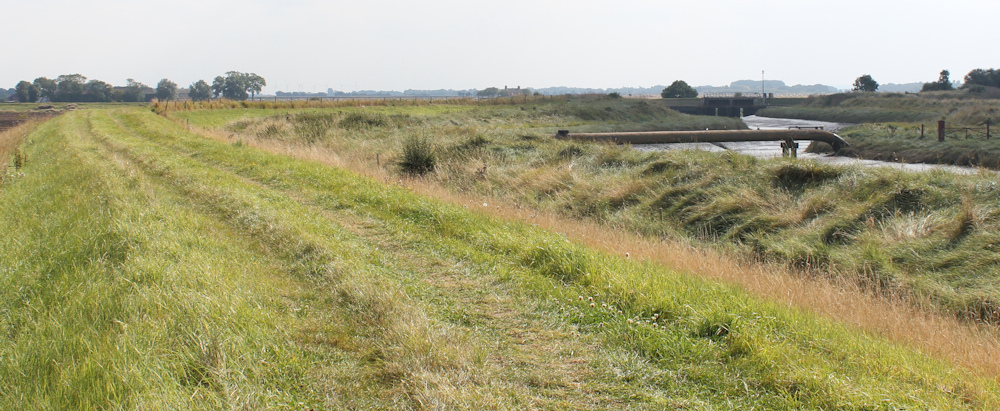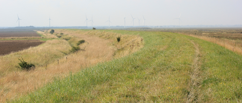 I’ve passed somewhere on my map that’s called “Northcoates Point” and now the bank begins a slow curve. Ahead are the Tetney Marshes and, in the distance, a line of ghostly windturbines.