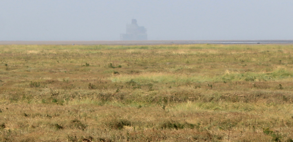 Peering out to sea, I spot what I assume is a large boat. A tanker, maybe. It rises high out of the water and appears to be moored. I take a blurry photo of the ship across the grassy marsh.