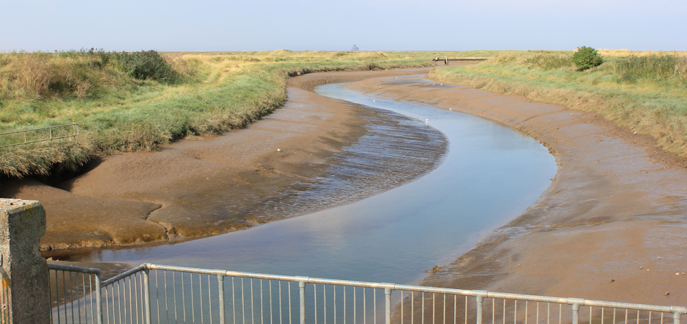 The tide must be low, because at the moment the Haven is only a narrow stream running between wide, muddy banks. I stop on the bridge to take photographs of the curving waterway. It’s milky blue in colour, reflecting back the hazy sky.