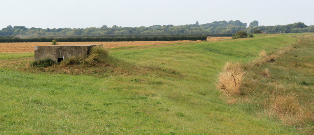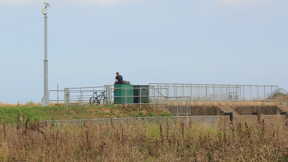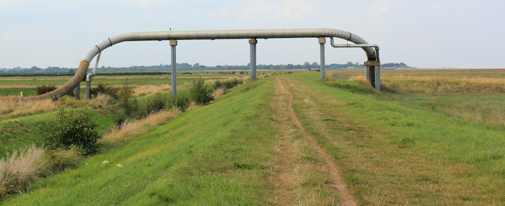 I turn right at a pill box, and continue along the sea bank. Pass under a huge pipe. What is this carrying? Water? Gas? Oil?