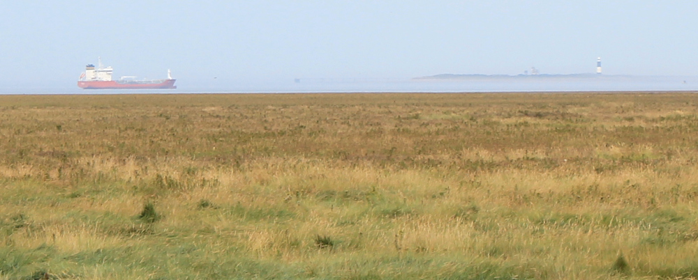 Out to sea, across a mile or more of marsh and grass, a few misty ships glide along. And there’s a lighthouse too… oh, check my map… that must be Spurn Point lighthouse! On the other side of the Humber!