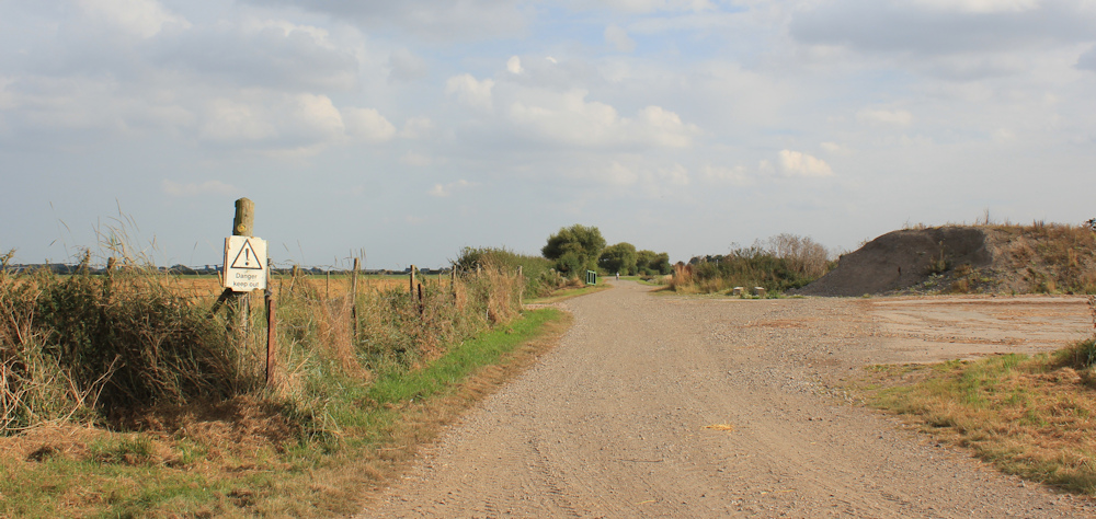 The footpath meets a track – called Newton Marsh Lane on my map. Here, there is a large turning space for machinery, and a deep, foul-smelling pit filled with murky water and a “Danger” sign.