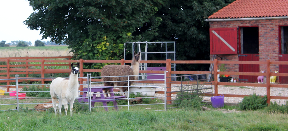 About a mile along the track, I come to a collection of farm buildings, and a set of stables with a group of llamas standing in a field. After miles of empty fields, it’s good to see some livestock. And they’re not cows, so that’s an added bonus.