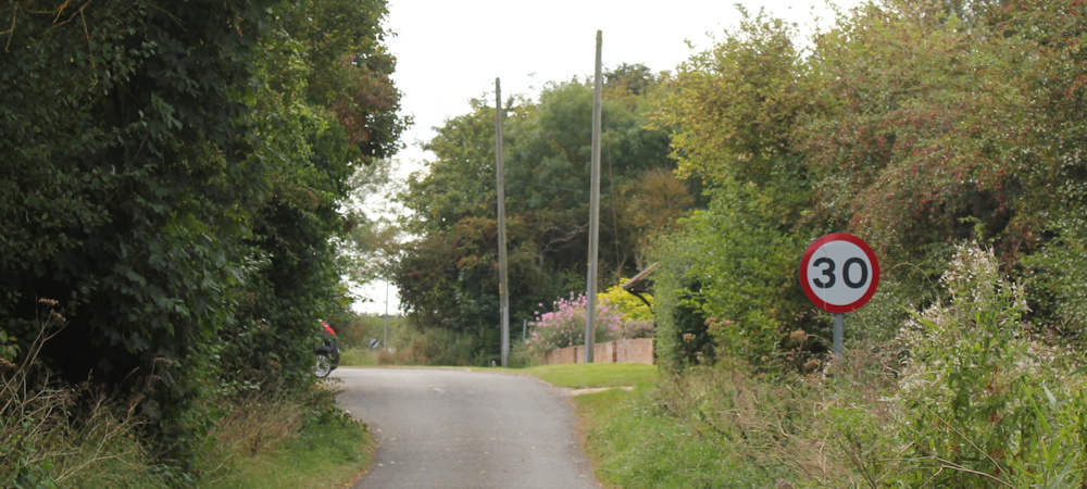 The lane is pleasant, with bushes and trees on either side, but I’m growing tired now, and begin to count my footsteps. (This is never a good sign!) Two hundred and three, two hundred and four… oh, a 30mph sign ahead. I’m nearly at the village.