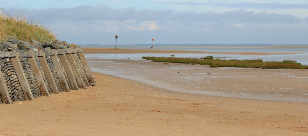 Here the marsh seems to disappear, and a beach begins. I climb down and follow the curve of the sea defences. Finally, I’m walking on sand again. This is lovely.