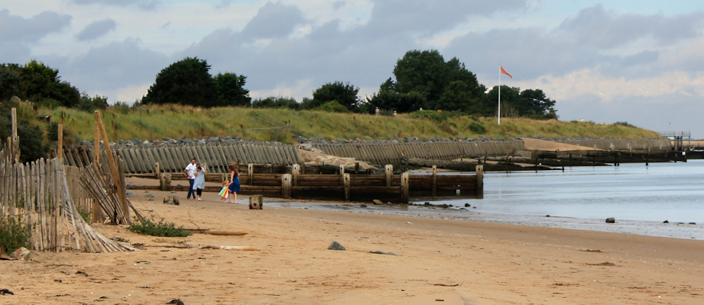 Ahead, a family is making the most of the shore. But I can see I’m running out of beach. Maybe when the tide is out you can walk further along the sand, but today the water is right up to the top of the breakwaters.