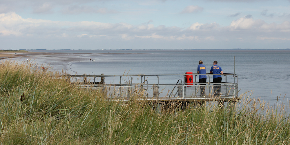 The sign mentions Beach Safety Officers, which I take with a pinch of salt… until I spot a couple of them, standing on an access platform and watching the beach.