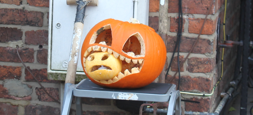 At the T junction, I turn right and follow the road as it bends around and heads northward. It’s not long after halloween and bonfire night, and I’ve come across a few decaying pumpkins in people’s gardens. This one is quite amusing. A cannibal pumpkin.