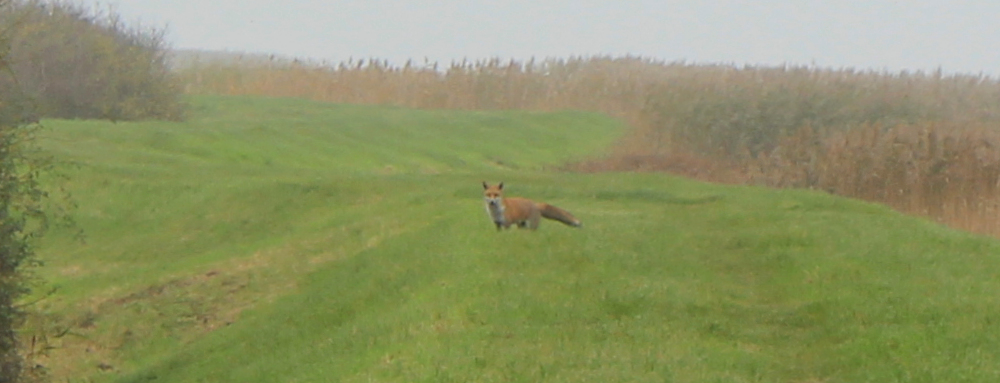 I walk on to the place where he saw the deer. No sign of them now, but – what’s that? A fox! I manage to catch a photo with my camera on full zoom, before he disappears off into the bushes.