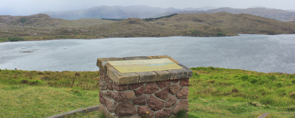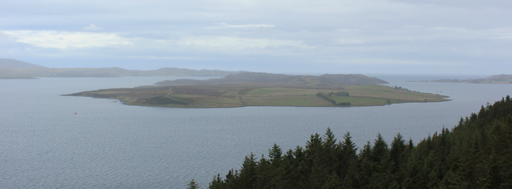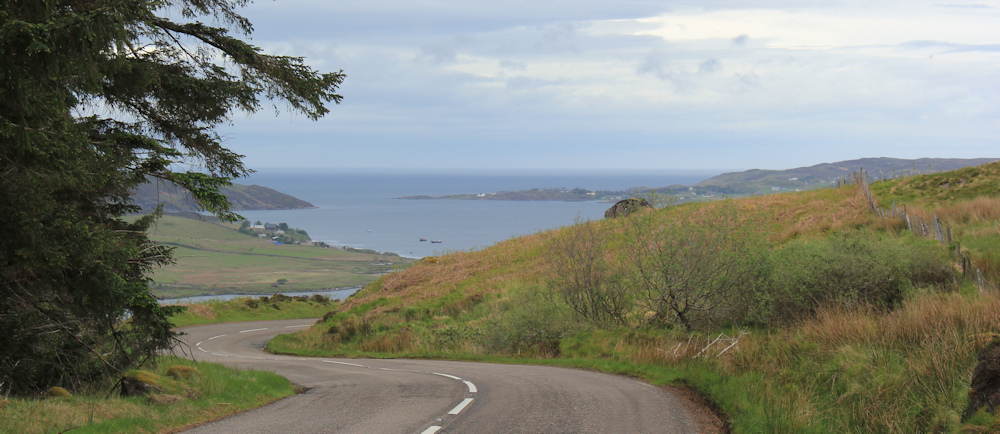 Around a corner, and there is a great view over the Isle of Ewe. I pull my camera out again. Sadly, it’s too dull and misty to get a decent shot, but I can see neat fields and a couple of houses.