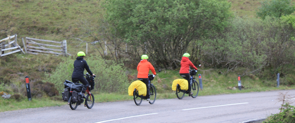 A trio of cyclists whizz around the bend, making the most of the downhill stretch to pick up speed. They look bright with their waterproofs on. Fully laden touring bikes – maybe doing the N500 by pedal power? All women, too.
