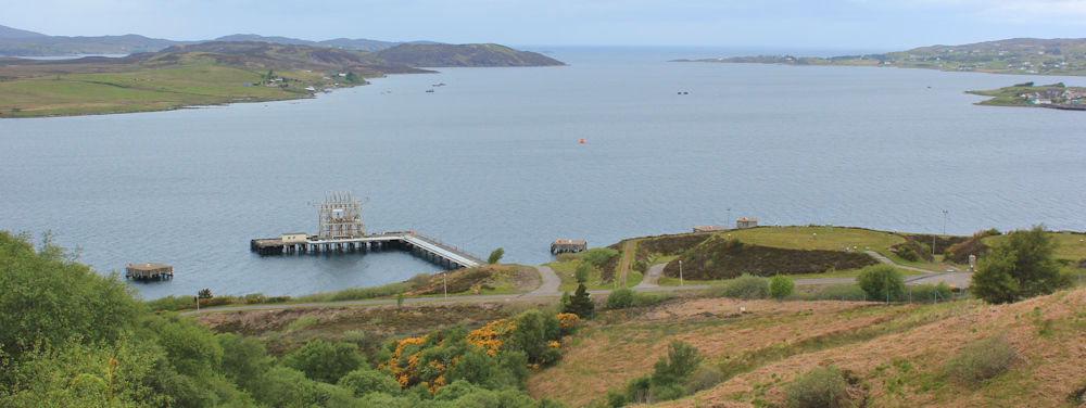 I stand at this new viewpoint and take photos across the bay. There’s the Isle of Ewe to my left, and I can see right down to the mouth of Loch Ewe and the open sea beyond. Below me is a jetty and some industrial type structures carved into the slope. “Dolphins” says my map.