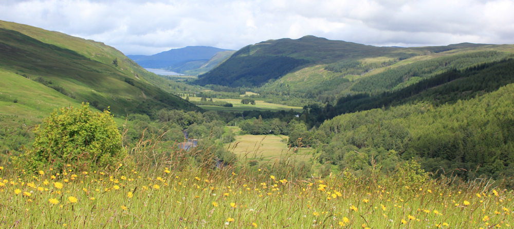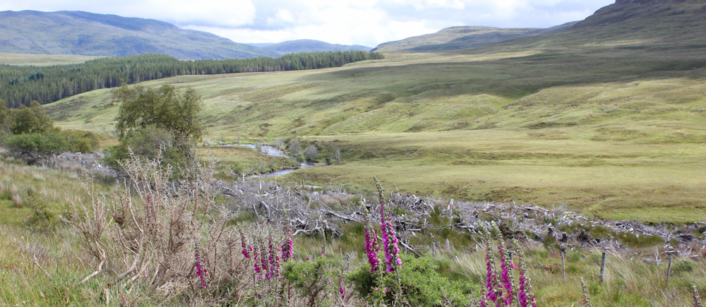 I walk past waterfalls, over another roaring river, past a sign that says this is the Cuileig intake, and then reach a place where a vista into another valley opens up. Beautiful.