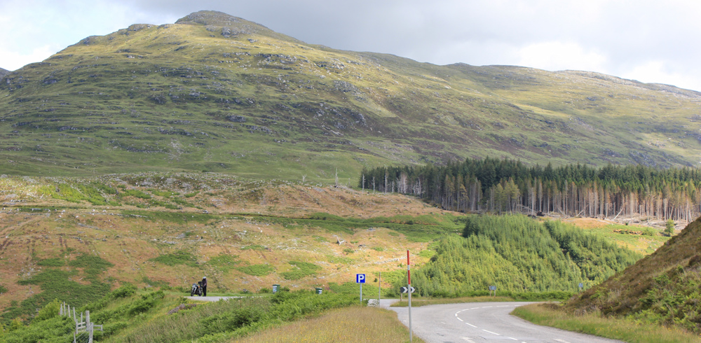 After a steep climb uphill, I come to another car park. This one has no view but is for visitors to the Corrieshalloch Gorge. It is full. So, I decide the gorge must be worth seeing.