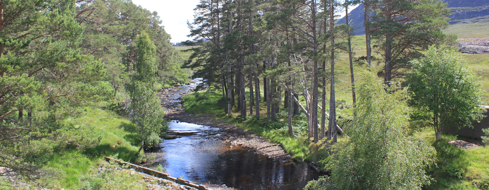 Past the building site, a sign tells me I’ve nearly reached the Braemore Junction. But, first, the road swings around a corner and crosses a wide, shallow river. [The Abhainn Droma, I find out later.] This river must, I guess, feed down into Loch Broom.