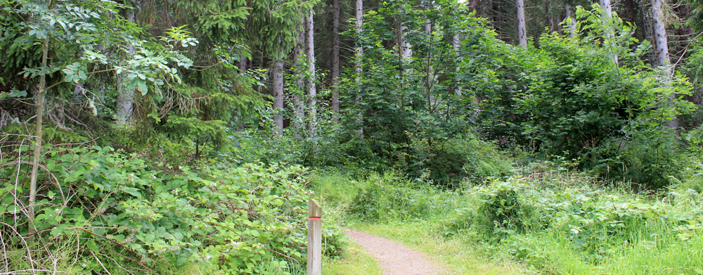 After climbing up a slope- disappointingly dominated by boring old conifers – I emerge onto a wide, flat track which leads through the woodland along the side of the slope. More boring old conifers.
