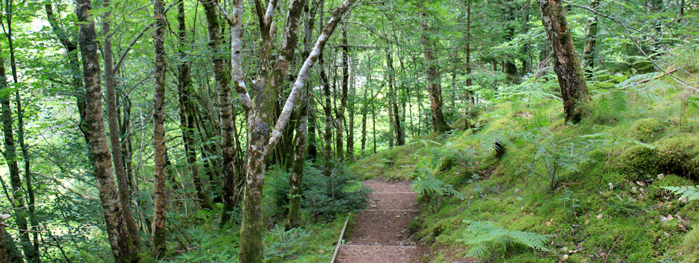 It’s time to turn downhill – a steep descent but along a well-maintained path with easy steps. Here there is a better mix of trees, with silver birch predominating.