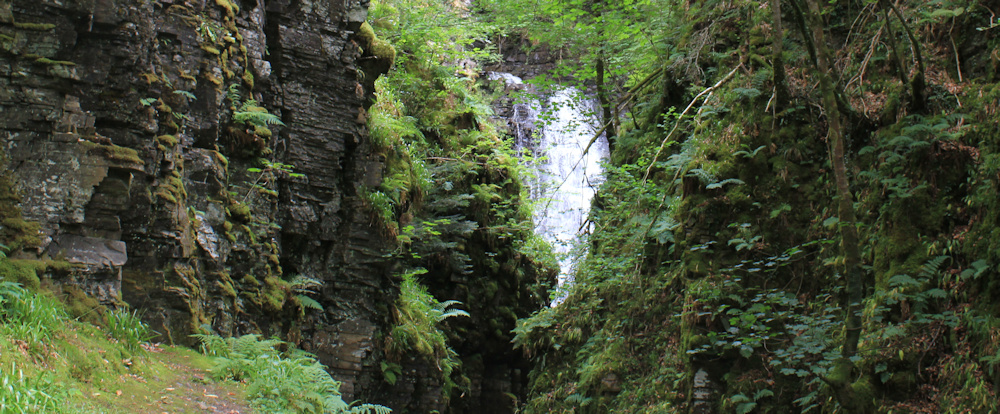 At the bottom is a second car park, and I hear a roaring sound – not traffic, but a waterfall. Following a narrow path between the rocks, I get a good view of the water. Sadly, the little gorge is too dark for decent photography.