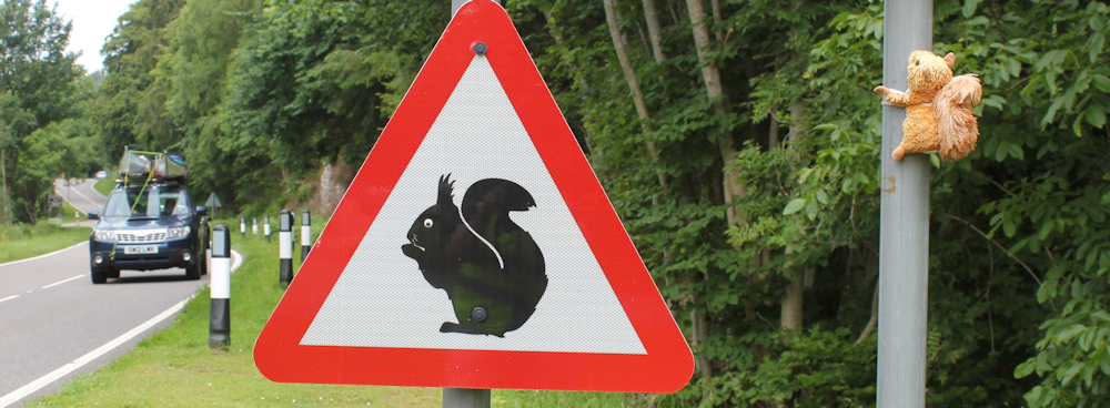 A sign warns of squirrels, and someone has tied a stuffed squirrel (a toy, not a real one) to a nearby post.