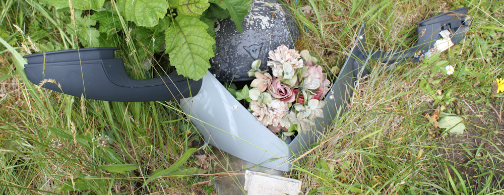 Turning back to the main road, I notice something in the grass on the verge. It’s a memorial – created out of a few motorbike parts and a helmet. Oh dear.