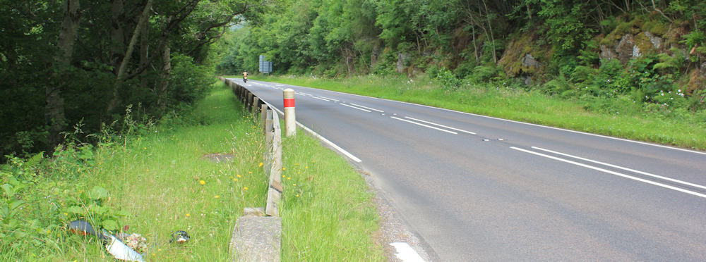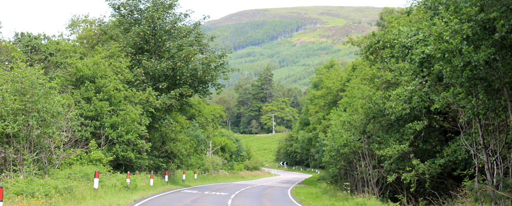 Onwards, along the road. Funny how this main road seems dwarfed by the landscape. In this vast Scottish countryside, a major strip of tarmac is turned into something trivial and insignificant.