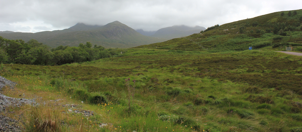 So, here I am, back at the Drumrunie turn-off. I stow my bike behind a green shed, and snap a photo. That’s the road I will walk down today – a narrow, single-track road that threads its way along the side of a long valley.