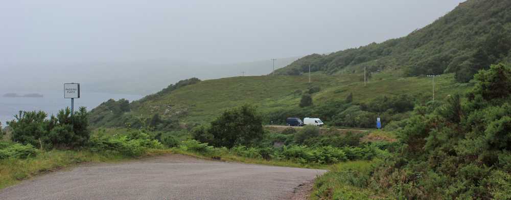Round a corner, and next to a passing place, I spot an area of flat rock. Well, it is not ideal, but it does make a reasonable place to stop for my picnic lunch. I manage 5 mins… before the rain starts to fall again.