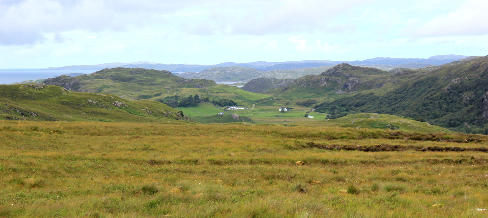 When I reach the top, one of those miraculous things happens. The landscape falls away in a glorious view down the hillside to the valley below. There’s the sea in the distance – the sea! And little white homestead down there which must be… check my map again… either a fish farm or Inverpolly Lodge.