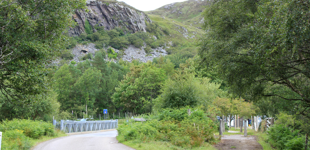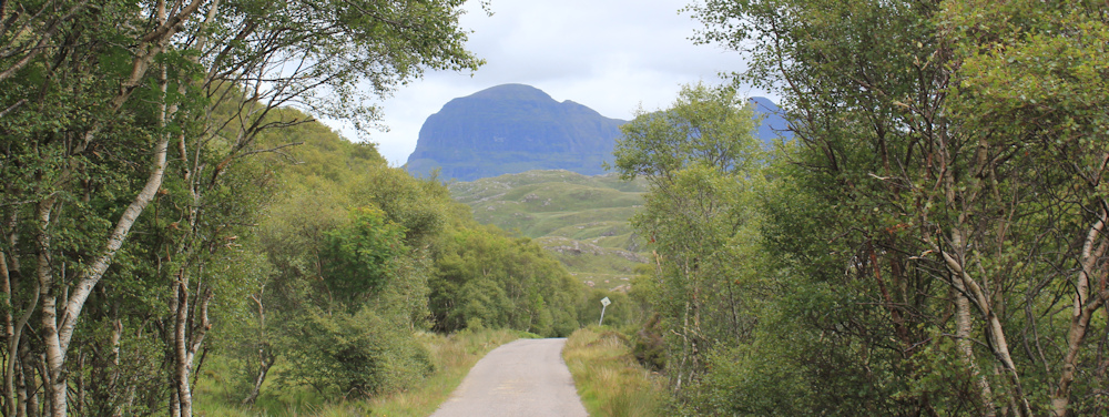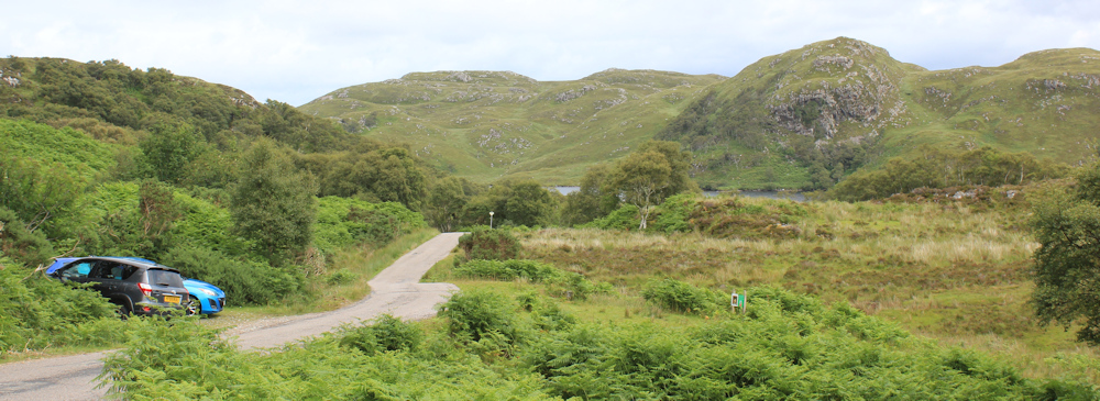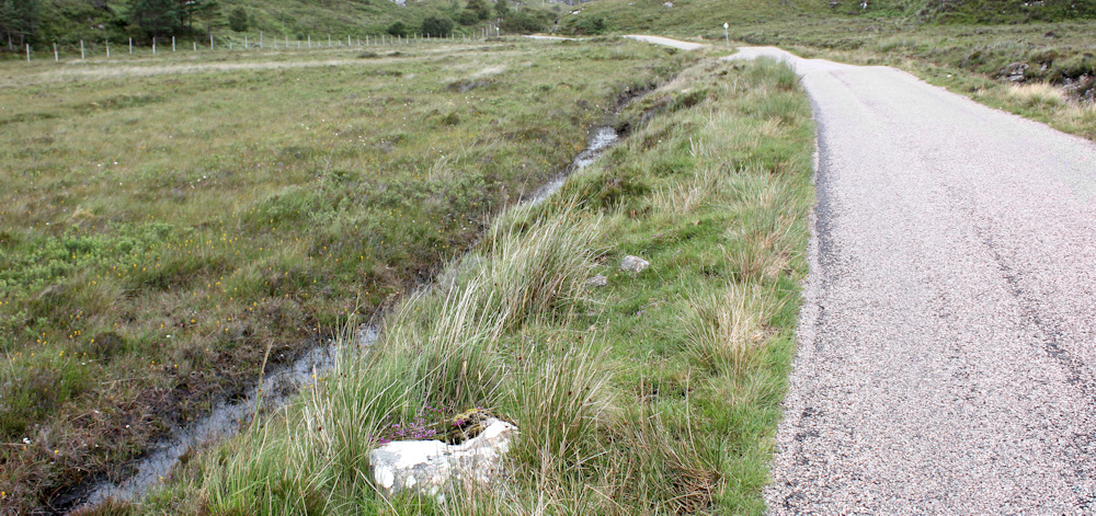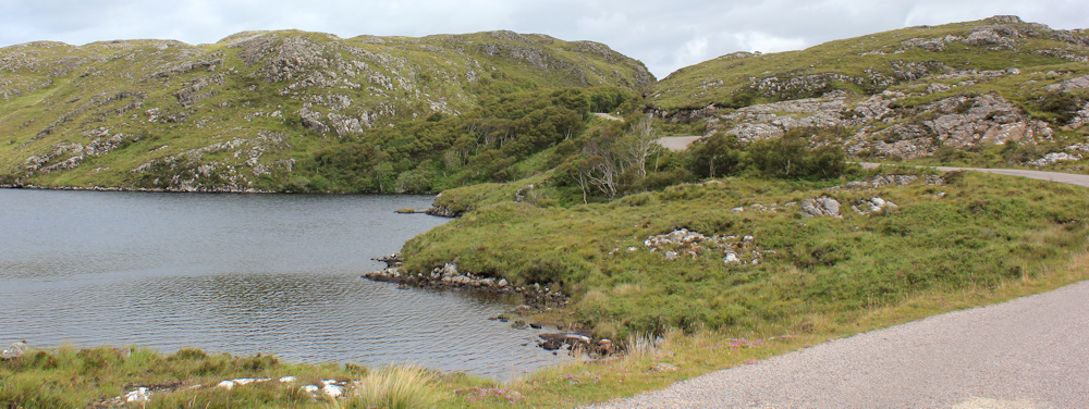 Beyond the fish farm, the road bifurcates. The main public road swings round to the right, while the branch to the left goes to Inverpolly Lodge.