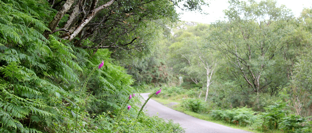 The road is lovely, although a little worrying to find the verges are so narrow. There has been little traffic so far, but I’m nervous about drivers speeding around blind bends. Love the foxgloves. Create punctuation marks of colour among the green ferns.