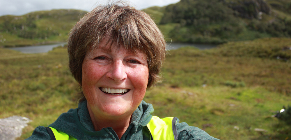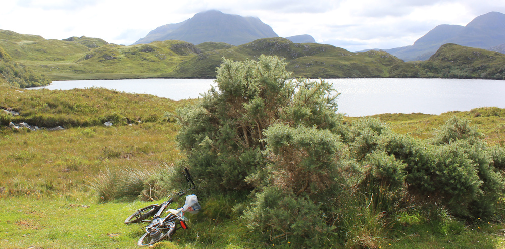 I cycle along the “wee mad road” from Lochinver to the parking spot overlooking Loch Buine Moire. Leave my bike chained up behind a gorse bush…