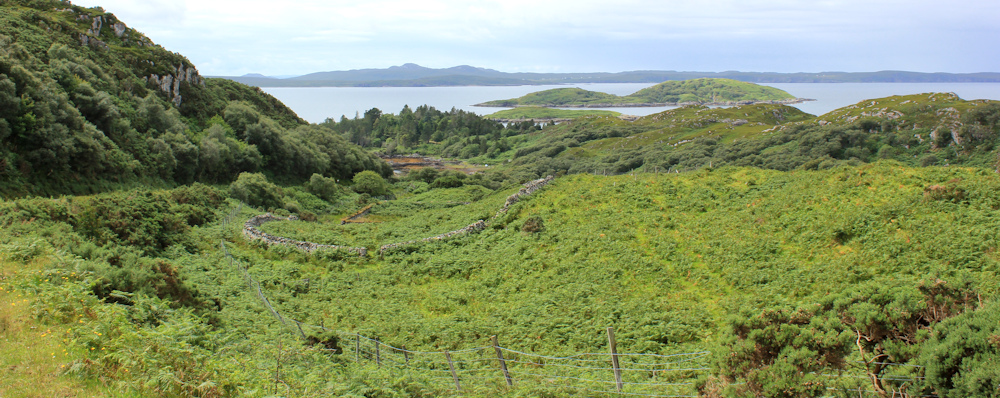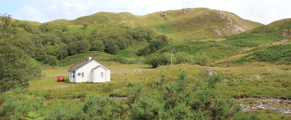 Love this little cottage. Earlier, while cycling along here, I saw a family walking across the fields towards this place, but now only the parked car indicates the presence of humans. In Scotland, even the smallest cottages feature on the OS map – Rhegreanoch is written above a small square indicating a building.