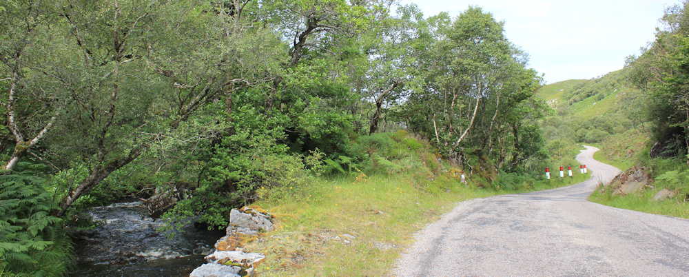 Leaving the loch behind, the road slips around the slopes of a hillock (Creag Dhubh on my map), following a narrow valley downwards. I’m walking alongside a little river – with the snappy name of Allt Gleann an t-Strathain – which drains the loch into the sea.