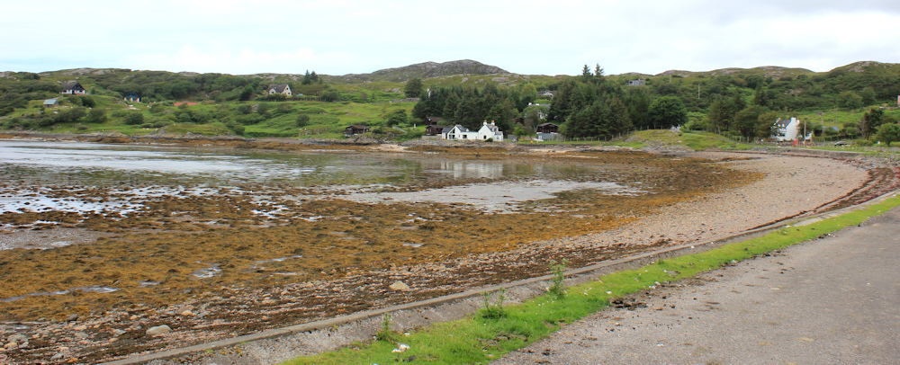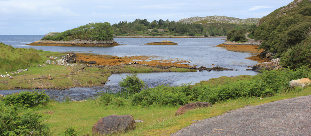 Round the corner, I reach another pretty bay. This one is edged by houses, and the place is called Inverkirkaig – meaning a place where rivers meet, I think, in English.