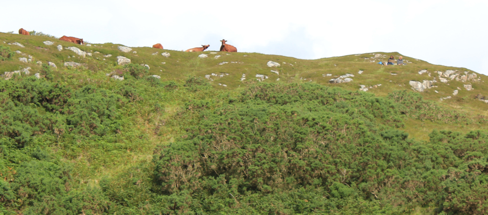 Only later, as I get closer to the top of the hill, do I spot the human figures sitting on the ridge (you can just seem them to the right of the photo above.) Two women are having a picnic. They give me a self-conscious wave as I pass below them. And I wave back – too far away to explain that I was really waving and shouting at the cows earlier, not at them.