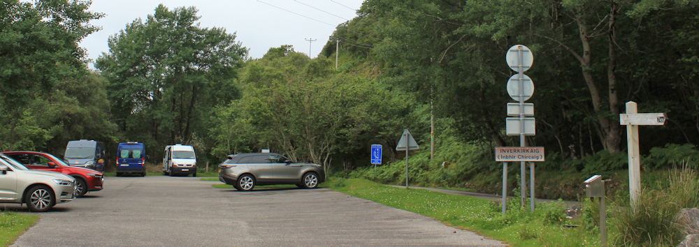 Onwards, down the hill towards Lochinver, and I reach a wide parking area. No cars or vans now (there were a couple of campers parked here when I cycled past earlier). A sign tells me this is Woodside Car Park, and requests that only one van camp here at time, to leave room for other visitors.
