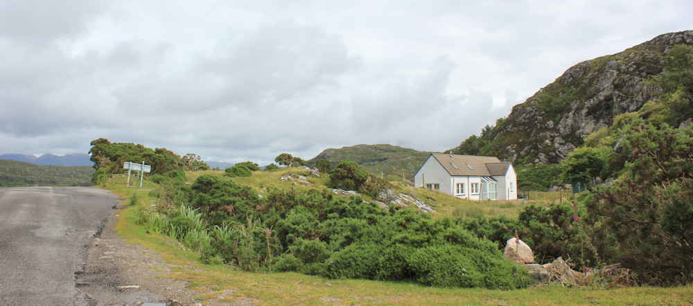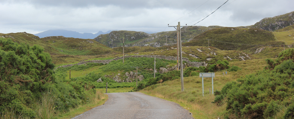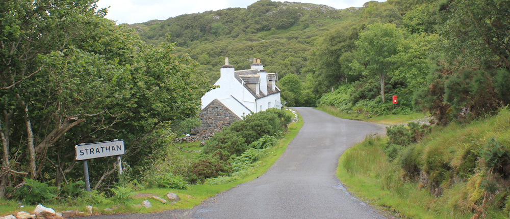 Up another rise, towards the sign that marks the end of the village of Strathan, and a white cottage perched near the top of the hill.