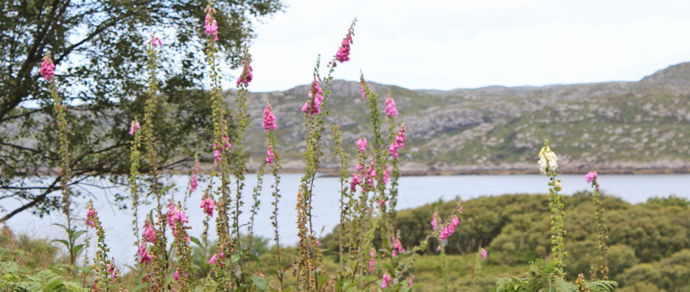 I’m walking just inland of the shore. Can see the water of Loch Inver beyond a fringe of vegetation – bushes and trees, and the occasional bright spash of foxgloves.