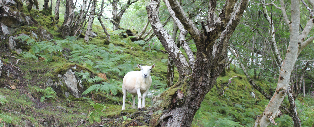 Past the turn-off to some holiday lodges, and a few ramshackle sheds. Down into a valley, with wooded slopes on either side. Hello sheep! He obviously thinks he’s a mountain goat.