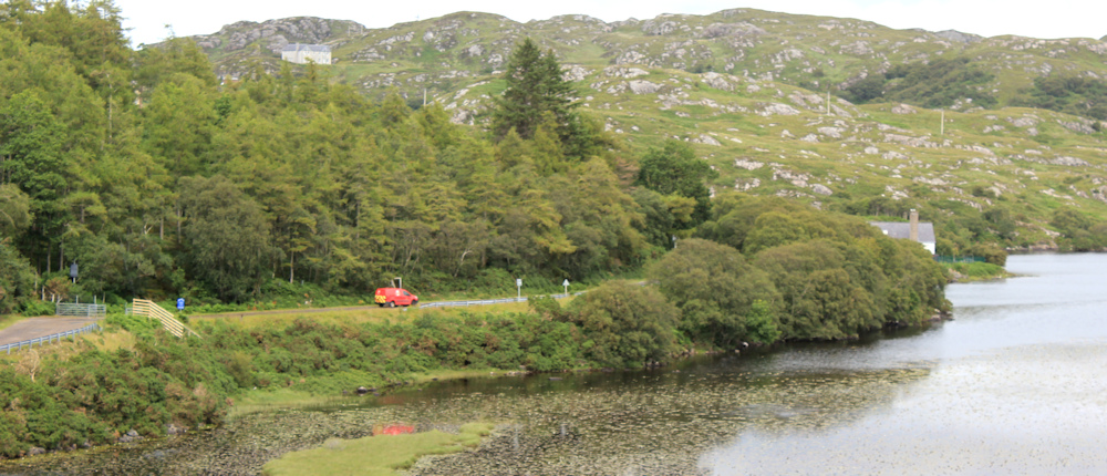 As I get further down the hill, the post-office van overtakes me, and I snap a photo as it passes along the road beside the loch.