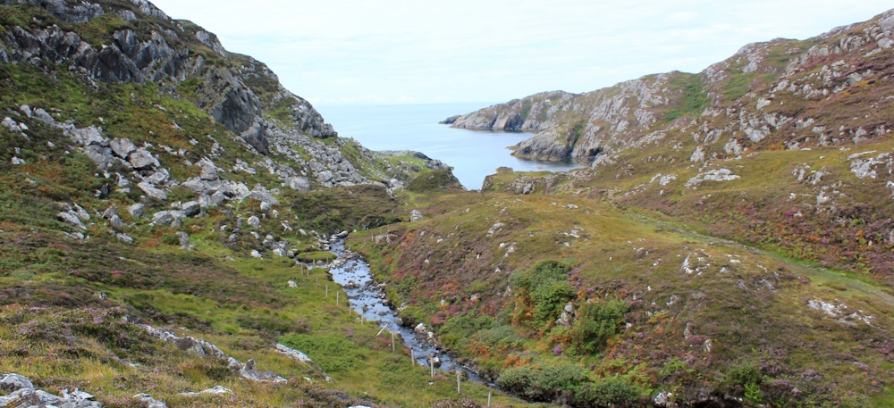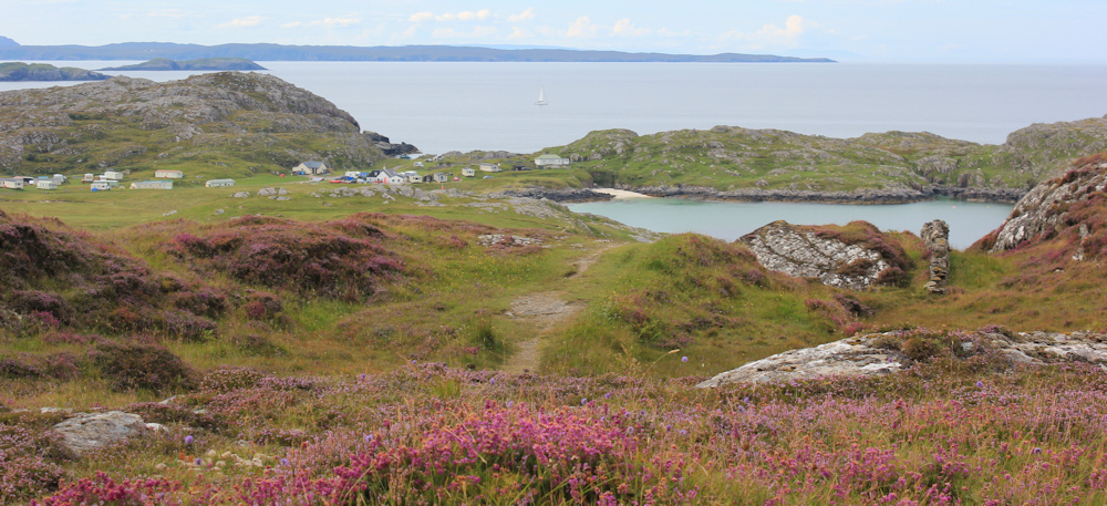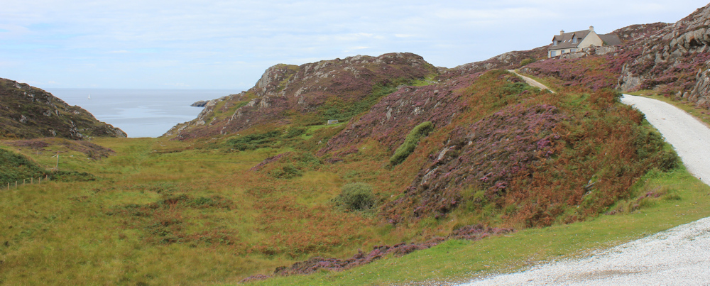 I climb the path, which pases to the left of the little white cottage, and stop for a breather near the top of the slope. Look back. What a wonderful view – over the heather, over Achmelvich Bay, across my campsite, and down to the entrance of Loch Roe. A small sailing boat is making it’s way up the shore. Wonder where it’s going?
