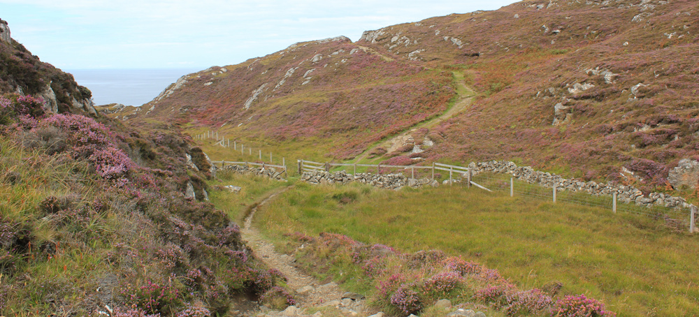 I follow the path as it passes between two rocky outcrops and over the crest of a ridge. Now, I’m looking down into the next valley. Down to a gate in a wall, and then up again. Onwards.
