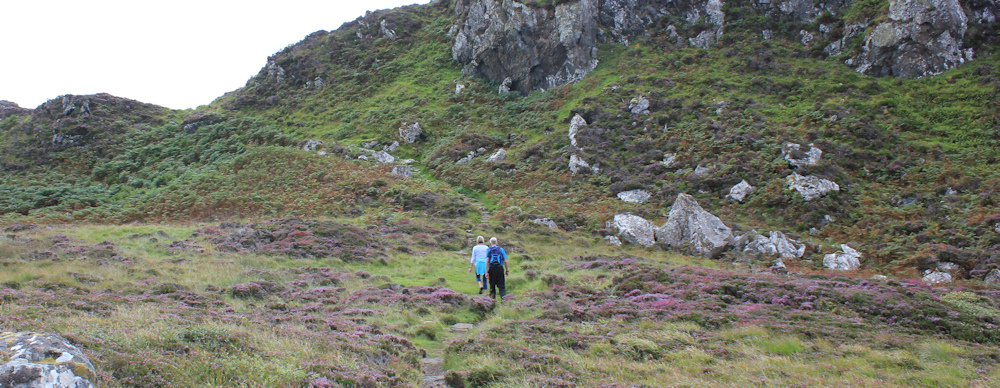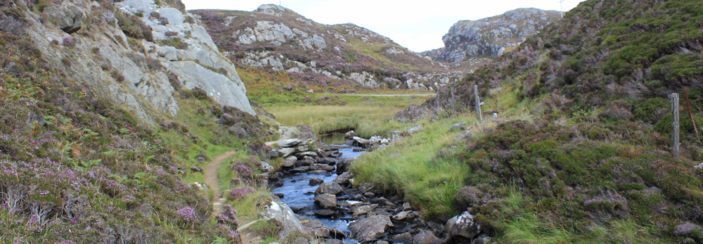 The path climbs down into the valley, and here I spot a couple of walkers – the first people I’ve seen since I left Achmelvich Beach behind. We stop for a brief chat and agree it’s a lovely day and a wonderful path. They’re heading back to Achmelvich now.